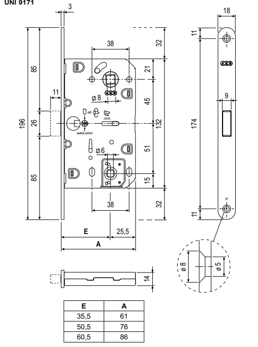 – wymiary czoła zamka: 18x196mm – otwór na trzpień klamki: 8mm