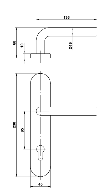 - Rozstaw (odległość od osi obrotu klamki do osi obrotu wkładki: 85mm