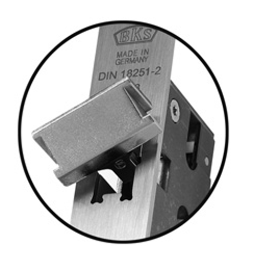 Zamek BKS 1314 jest stosowanych w standardowych drzwiach profilowych aluminiowych. Zamek ten jest kierunkowy tzn. występuje jako DIN lewo lub DIN prawo. Rygiel jest zakluczany ręcznie do położenia końcowego wysuwu 20 mm, a szerokość kasety zamka wynosi jedynie 15,5 mm.