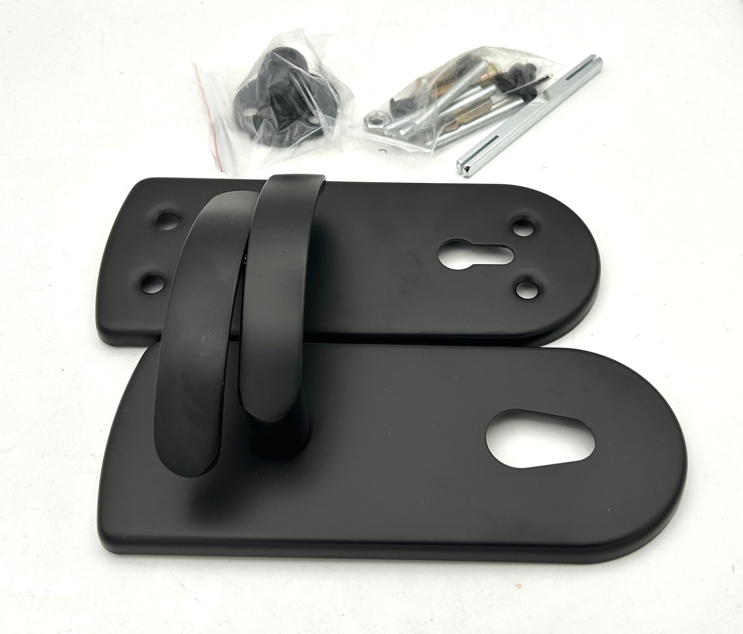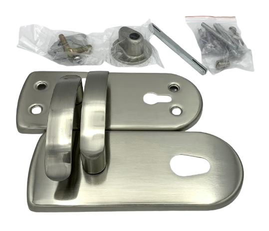 Osprzęt zawiera szyld, klamkę, osłonę cylindra, łącznik klamki oraz śruby i nakrętki potrzebne do montażu.