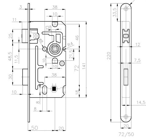 Zamek magnetyczny zapadkowo-zasukowy, zamykanie na niezależne od języcza magnetycznego. W zamku zastosowano wyciszenie zapadki zamka, dzięki czemu zredykowany jest do minimum moment przciągnięcia jeżyczka do zaczepu w ościeżnicy. Rozstaw tradyjny 72mm pozwala zamontować również klasyczne klamki z długim szyldem.