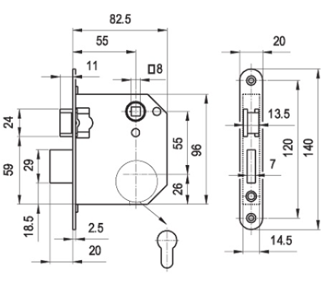 Zamek wpuszczany przeznaczony do stosowania w drzwiach zewnętrznych lub wewnętrznych.