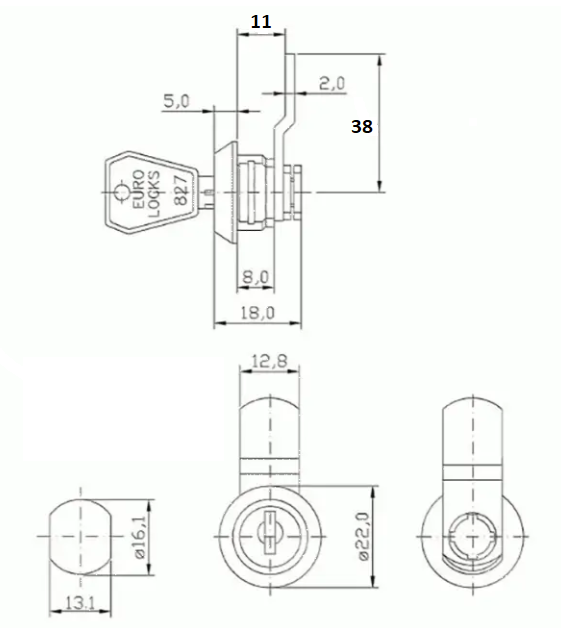 ZAMEK KRZYWKOWY EURO-LOCKS 0202, ODGIENTY, DŁUGOŚĆ GWINTU 8mm
