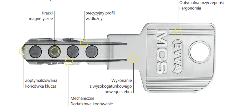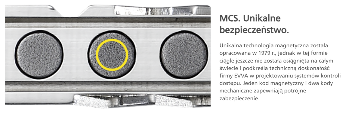 We wkładce MCS z lewej i prawej strony otworu na klucz znajduje się w sumie 8 rotorów magnetycznych z możliwością obracania, do których są przyporządkowane 4 krążki magnetyczne klucza. Uprawniony klucz z odpowiednim kodem umieszcza rotory w pozycji zamykania. Mechanizm zlokalizowany powyżej daje sygnał do zamknięcia. Klucze MCS łączą dwie technologie zabezpieczeń zapewniając potrójną ochronę: Kod magnetyczny oraz dwa kody mechaniczne.