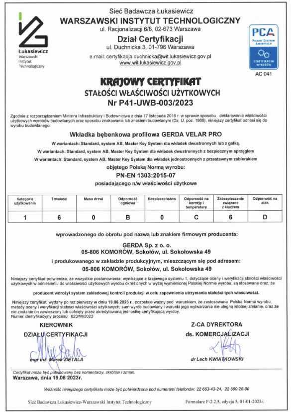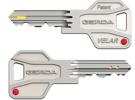 Nowa, certyfikowana wkładka bębenkowa w najwyższej klasie zabezpieczenia klucza – w klasie 6, oraz odporności na atak w klasie D (wg normy PN-EN 1303:2015). Wyposażona w opatentowaną technologię AVG® – Access Verification Gate, skutecznie zabezpiecza klucz przed nieautoryzowanym kopiowaniem. Dzięki zastosowaniu dedykowanych rozwiązań mechanicznych, materiałowych oraz konstrukcyjnych, wkładka zapewnia skuteczną ochronę przed otwarciem metodą BYPASS, manipulacją oraz próbami rozwiercenia. Wkładka zyskała odporność na przewiercenie dzięki zastosowaniu hartowanych szpilek zarówno w bębenku jak i w korpusie. Paracentryczny profil bębenka oraz mosiężne zastawki antypickowe chronią ją przed otwarciem metodami manipulacyjnymi. Zastosowane tu popychacze ze stali nierdzewnej przedłużają żywotność wkładki do 100.000 cykli otwarć/zamknięć. Wkładka jest certyfikowana jako wkładka przeciwpożarowa potwierdzająca możliwość stosowania jej w drzwiach o odporności ogniowej oraz dymoszczelnych. Posiada bezpieczne sprzęgło w standardzie. Wkładka charakteryzuje się najwyższą odpornością na korozję, co daje możliwość stosowania jej w trudnych warunkach środowiskowych. W zestawie z wkładką GERDA® VELAR Pro jest 5 kluczy – każdy z nich z innym kolorowym znacznikiem oraz karta bezpieczeństwa.
