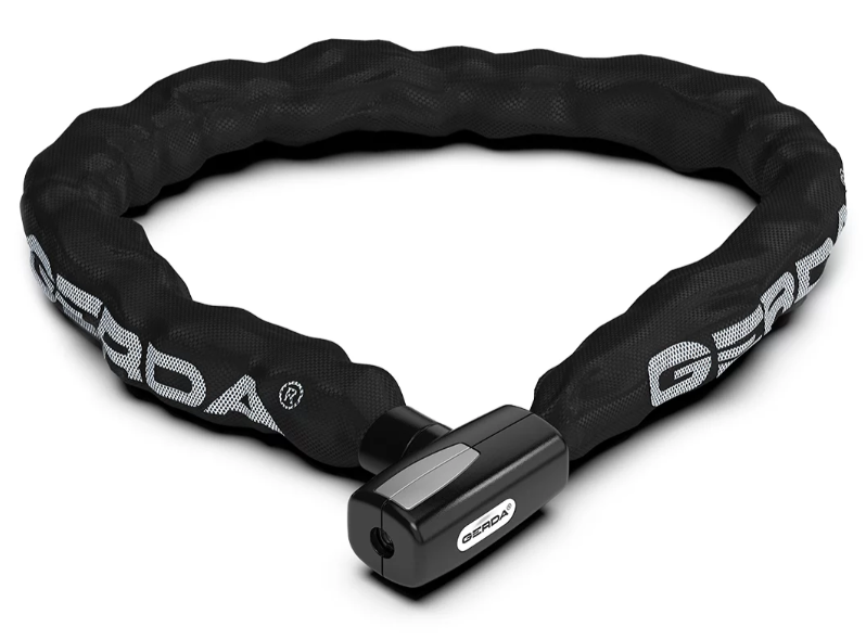 Łańcuch z utwardzonych ogniw 8 mm, o okrągłym przekroju, w rękawie ochronnym z materiału. Zapięcie rowerowe CONTRA 900/8W to hartowany łańcuch o długości 90cm wykonany ze wzmacnianej stali. Zamek Gerda posiada specjalną zatyczkę otworu klucza, która chroni przed pyłem, piaskiem, błotem oraz wszelkimi innymi zabrudzeniami.