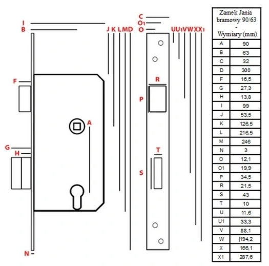 Zamek Jania bramowy 90/63 wpuszczany, używany w szczególności do bram i furtek.