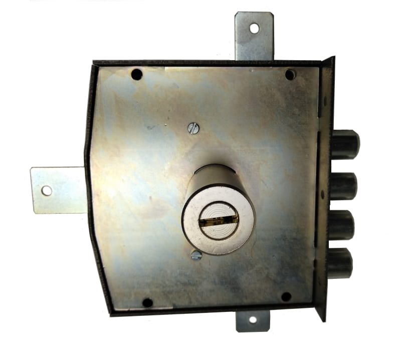Solidny, cztero bolcowy / ryglowy zamek nawierzchniowy do drzwi wejściowych z dodatkową zwrotnicą do ryglowania.