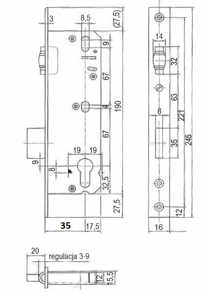 - Wysokość kasety zamka 190 mm