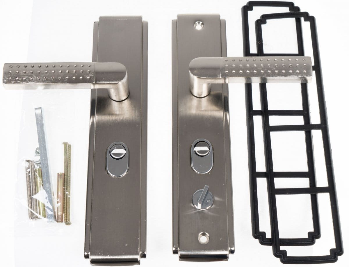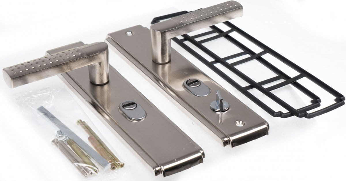 – Klamkę z szyldem wewnętrznym z pokrętłem do zamykania dolnego rygla