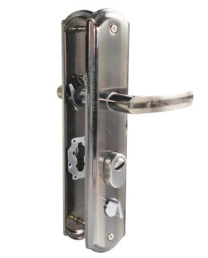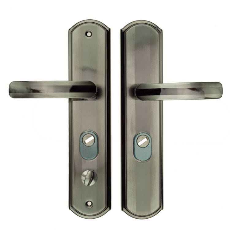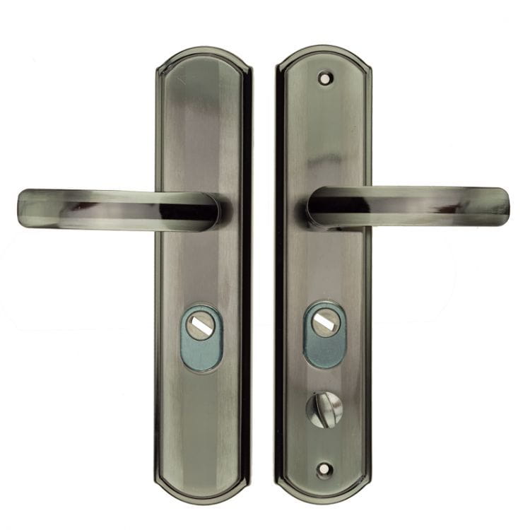 – Klamkę z szyldem wewnętrznym z pokrętłem do zamykania dolnego rygla