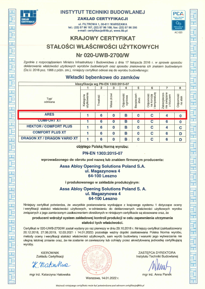 Wysoki stopień zabezpieczenia kodu klucza 4 badany zgodnie z normą EN 1303:2007