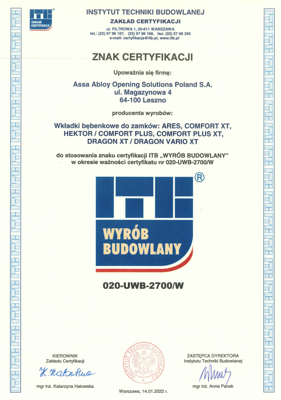 Wkładki posiadają atest ppoż – możliwość stosowania w drzwiach ognioodpornych