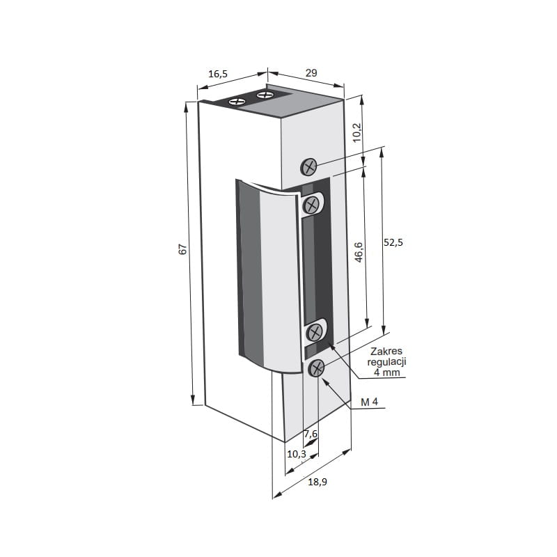 Zamek elektromagnetyczny w wersji podstawowej (bez pamięci, bez blokady). Elektrozaczep dedykowany jest do zastosowania zarówno w prawych, jak i lewych skrzydłach drzwi z kontrolą dostępu. Regulacja języka elektrozaczepu w zakresie 4 mm.