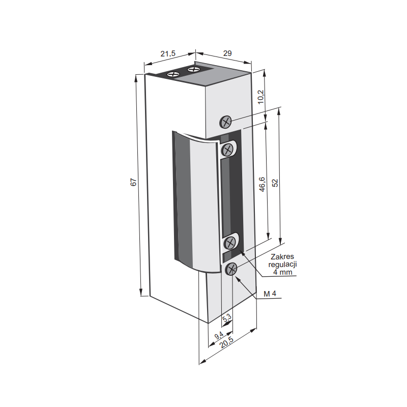 Elektrozaczep rewersyjny (NO – bez prądu otwarty) pozostaje zablokowany przy zasilaniu prądem stałym DC. Elektrozaczep dedykowany jest do zastosowania zarówno w prawych, jak i lewych skrzydłach drzwi z kontrolą dostępu. Regulacja języka elektrozaczepu w zakresie 4 mm. Rozstaw śrub montażowych 52 mm.