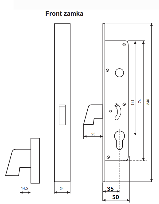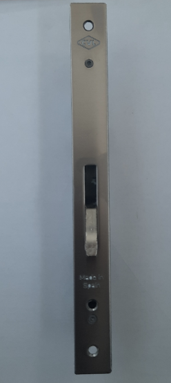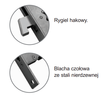Zamek hakowy do drzwi profilowych. Czoło wykonane ze stali nierdzewnej. Stosowany głównie w drzwiach przesuwnych.
