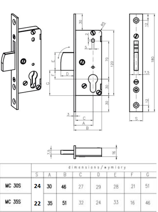 Zamek wąski MC-S zasuwkowy przeznaczony jest do drzwi z profili aluminiowych lub PVC.