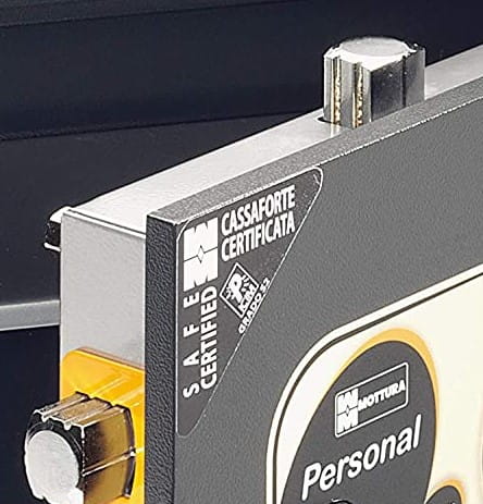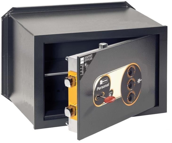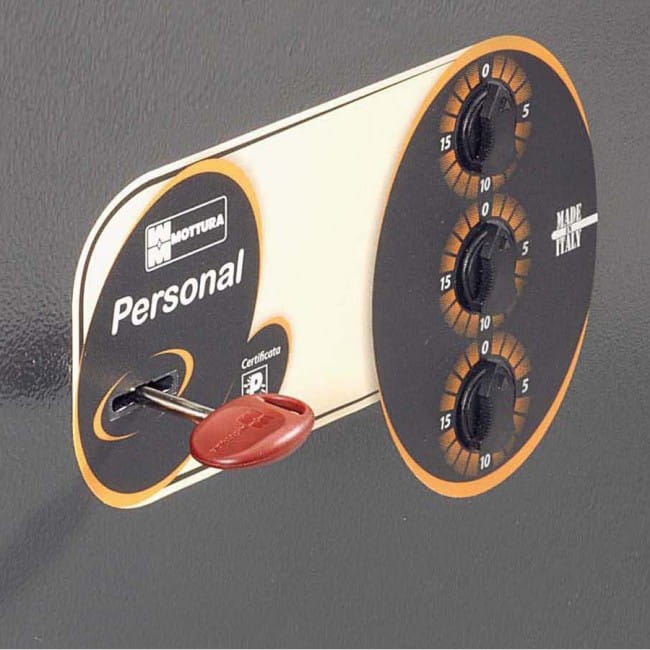 Zamek kluczowy certyfikowany zgodnie z normą EN 1300 dla klasy A, wyposażony w 8 asymetrycznych i niezależnych płytek, a także zamek mechaniczny szyfrowy (3 pokrętła posiadające po 20 kombinacji).