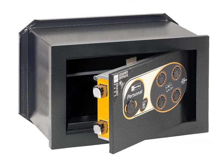 Zamek kluczowy certyfikowany zgodnie z normą EN 1300 dla klasy A, wyposażony w 8 asymetrycznych i niezależnych płytek, a także zamek mechaniczny szyfrowy (4 pokrętła posiadające po 20 kombinacji).