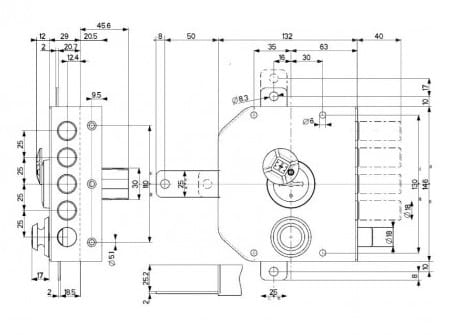 Solidny, 4 bolcowy+zatrzask / ryglowy zamek nawierzchniowy do drzwi wejściowych z dodatkową zwrotnicą do ryglowania.