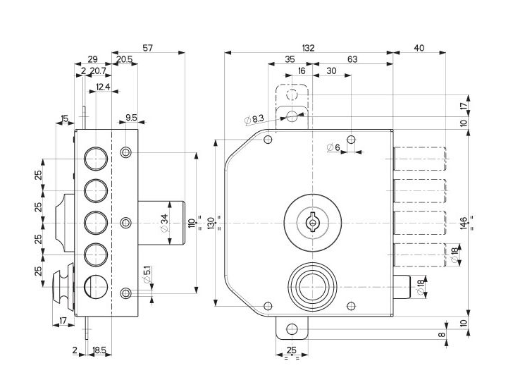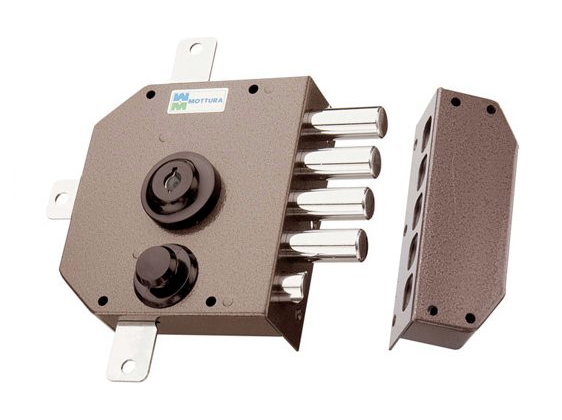 Solidny, 4 bolcowy+zatrzask / ryglowy zamek nawierzchniowy do drzwi wejściowych z dodatkową zwrotnicą do ryglowania.