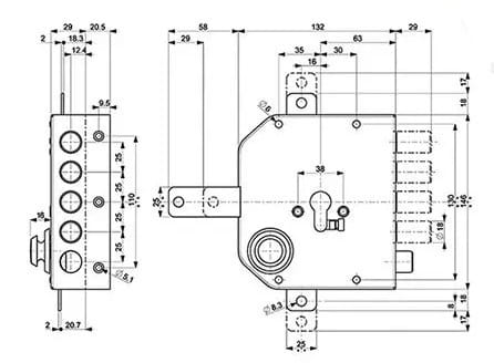Solidny, 4 bolcowy+zatrzask / ryglowy zamek nawierzchniowy do drzwi wejściowych z dodatkową zwrotnicą do ryglowania.