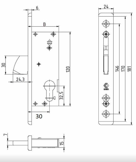 Zamek wpuszczany Karo KCM do drzwi z profili aluminiowych lub stalowych