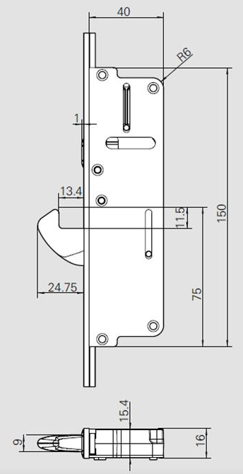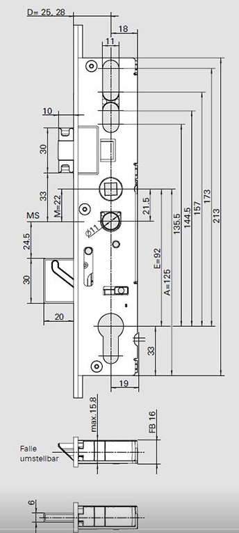 Zasuwnica z zamkiem głównym + 2 rygle hakowe sterowane za pomocą klamki .