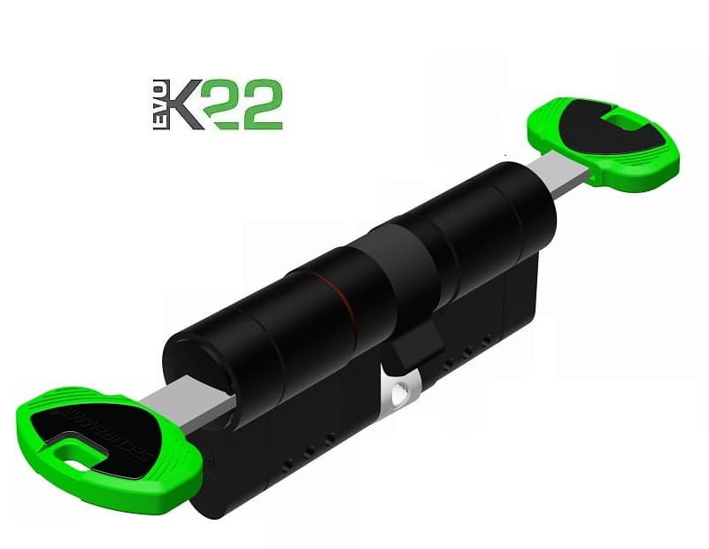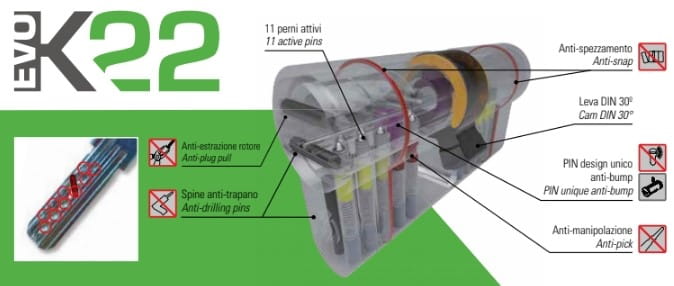 Wkładka bębenkowa Evok22 to wkładka MODULARNA, posiadająca wyższą odporność antywłamaniową dzięki 10 hartowanym sztyftom i 1 podwójnym ustawionym pod kontem 45 stopni utrudniającym znacznie wytrychowanie.