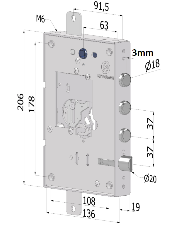 - 3 rygle o rozstawie 37 mm, wysów rygli w kasecie 3mm