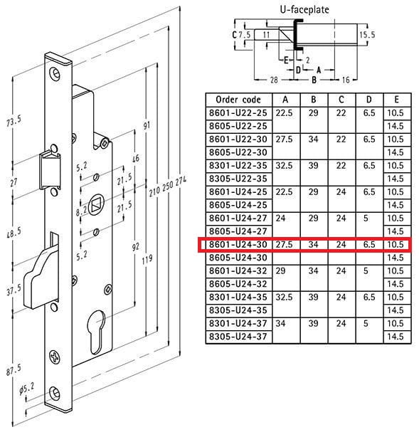 SOBINCO Zamek główny zapadkowy 8601-U24-30