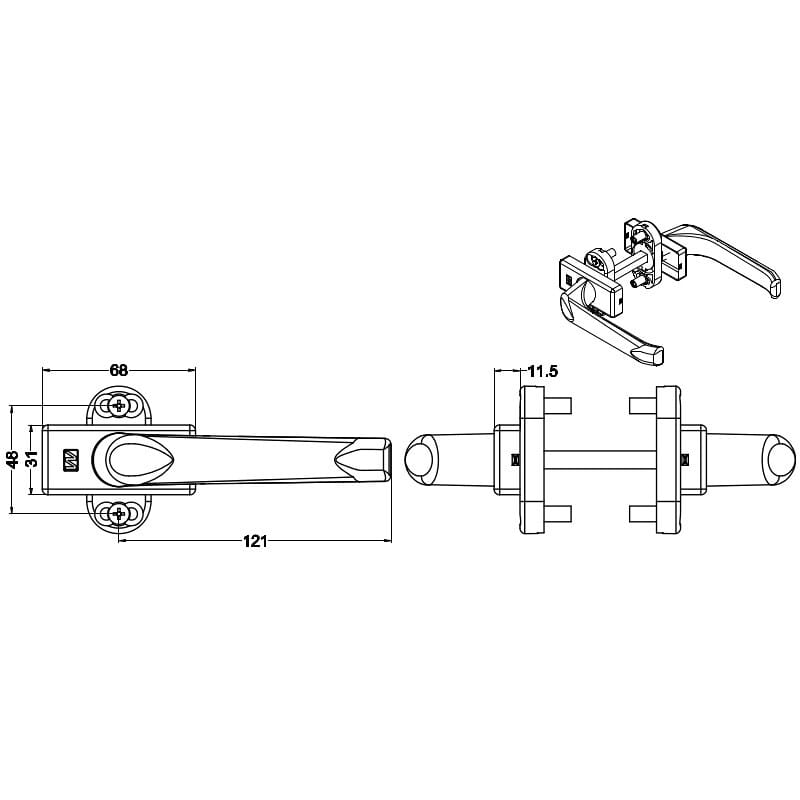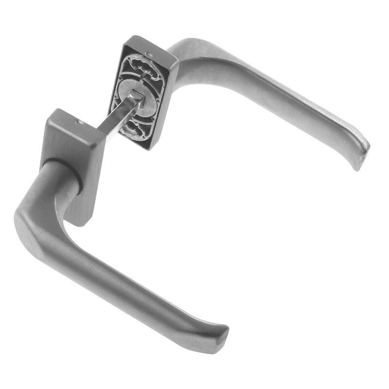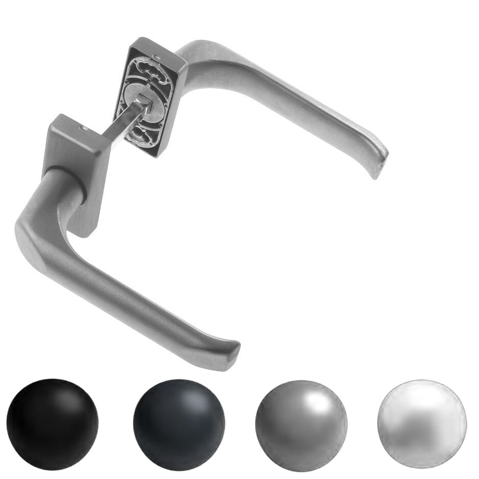 Podwójna klamka drzwiowa WALA H1 wykonana z odlewu aluminiowego, lakierowana proszkowo. Wyposażona w sprężynę powrotną, standardowy trzpień kwadratowy 8mm do drzwi profilowych o grubości 40-55mm. Do profili aluminiowych zalecany montaż za pomocą nitonakrętek. Dłuższe trzpienie i rozetki na wkładkę dostępne jako oddzielne artykuły.