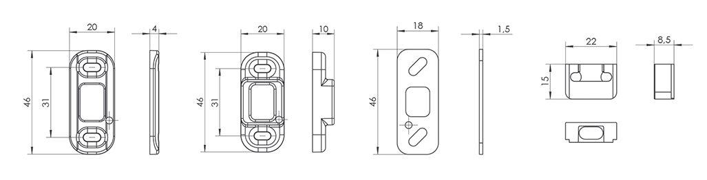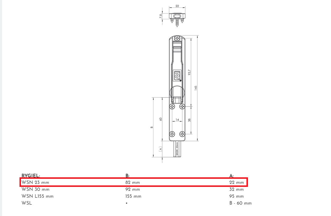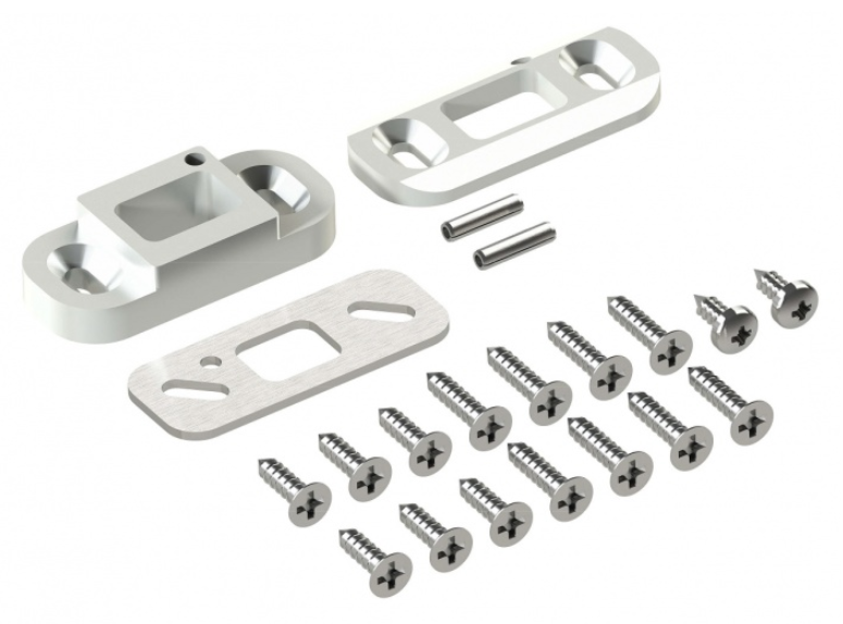 W skład kompletu wchodzi podstawa rygla z zaczepami i wkrętami.