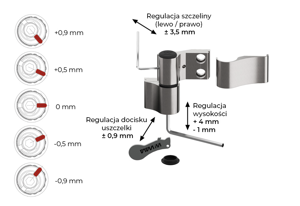 - regulacja pozioma w zakresie +-3mm, regulacja docisku uszczelki w zakresie +- 1mm